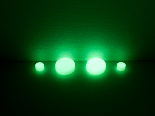 YouTube 高輝度蓄光材のNLストーン 丸型21mm-3.5gを室内照明での蓄光と発光です。
